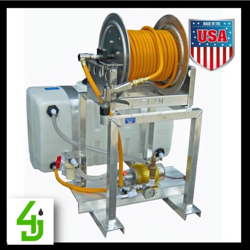 - Manual or electric hose reel with 150 ft or 300 ft of high pressure spray hose