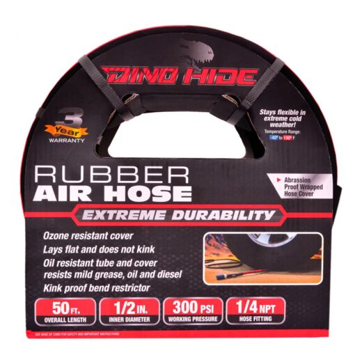 Industry leading 3-year Warranty. Dino-Hide Heavy-Duty Pro-grade wrapped rubber air hose is ideal for supplying compressed air to pneumatic tools and inflation accessories. The hose with wrapped finish is high strength, versatile & oil resistant rubber tube. Made up of abrasion, weather & ozone resistant EPDM rubber cover, it exceeds RMA 4:1 safety factor & RMA Class 'C' oil resistance. Bend-restrictor sleeve prevents damage near ends.